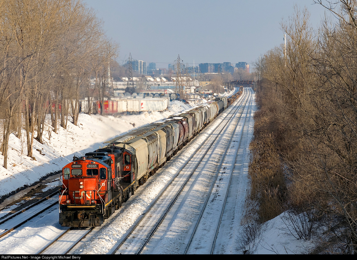 | Grain and intermodal empties. GP9's CN 7017 & CN 7228 are on their way to nearby Taschereau Yard with a mix of mostly empty grain cars and baretables (436 axles total) as they pass through Lachine during a brief sunny stretch this afternoon. |