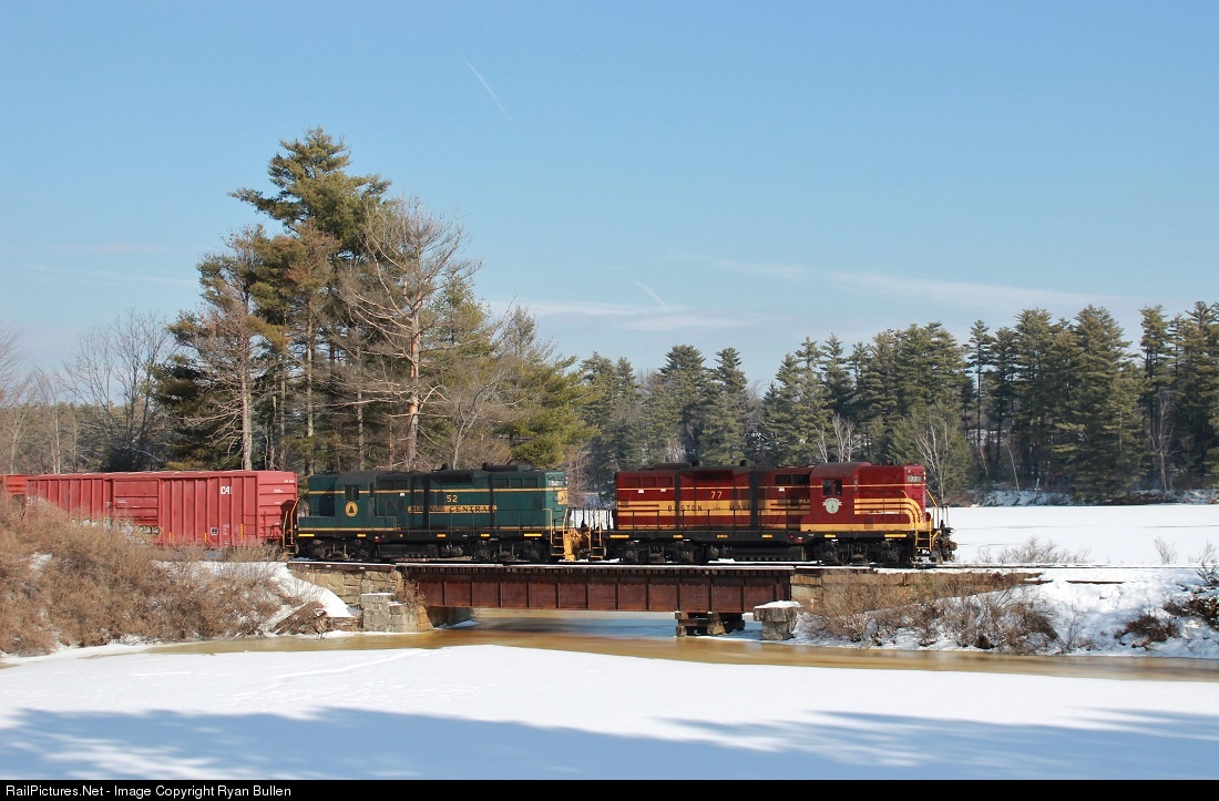 Sappi 3 tip toes over the mouth of Martin Stream in Skowhegan, with Pan Am Heritage GP 9's on today's train. The 77 representing the Boston & Maine, and the 52 representing the Maine Central, respectively. Even more fitting is that 77 is an original B&M GP9, built in 1957.