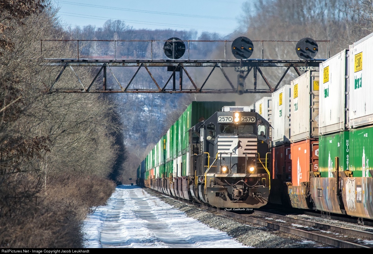 | A classic standard cab SD70 leads NS 20A under the PRR position Light signals at MP 334 on the NS Pittsburgh Line. NS 25Z is stopped on the opposite track waiting for traffic to clear up ahead. |