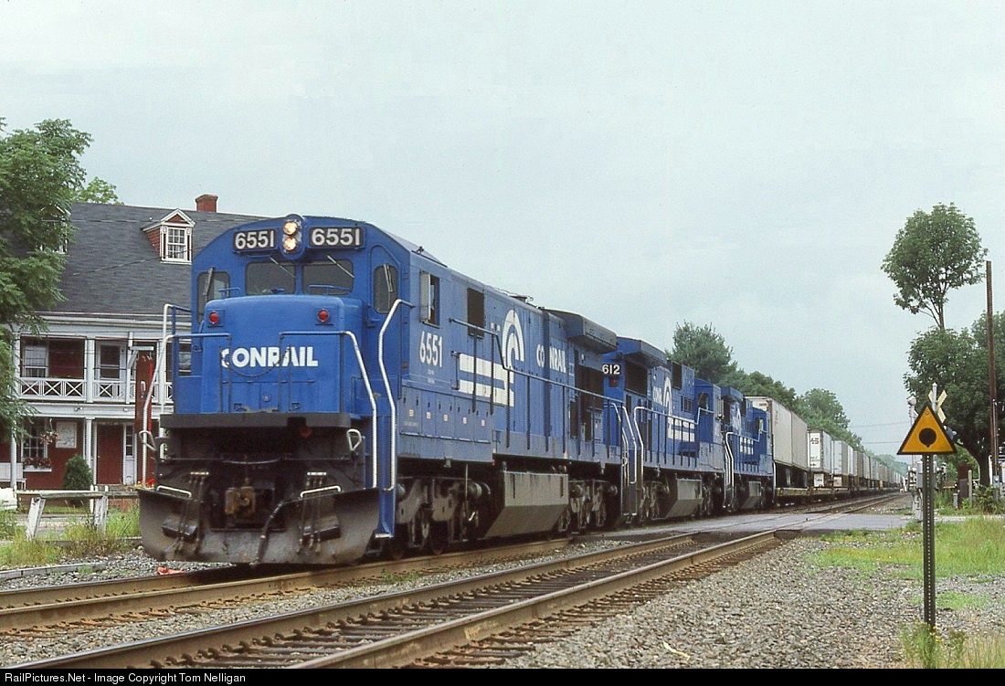 A long string of piggybacks follows the GE trio (U33C/C32-8/C32-8) up front as Conrail train TV-6 rattles the center of Ashland, MA, on the former Boston & Albany line. The building in the background, now a pub, opened in 1834 as the Railroad House, an inn for early travelers on the primordial B&A.