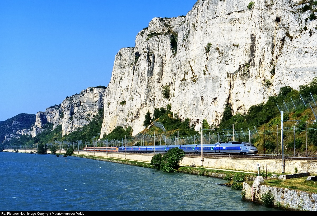 | SNCF TGV 18 "Le Creusot" and TGV 14 "Montpellier" riding as TGV 540/1 from Lille-Europe to Marseille-St-Charles alongside the Défilé de Donzère.