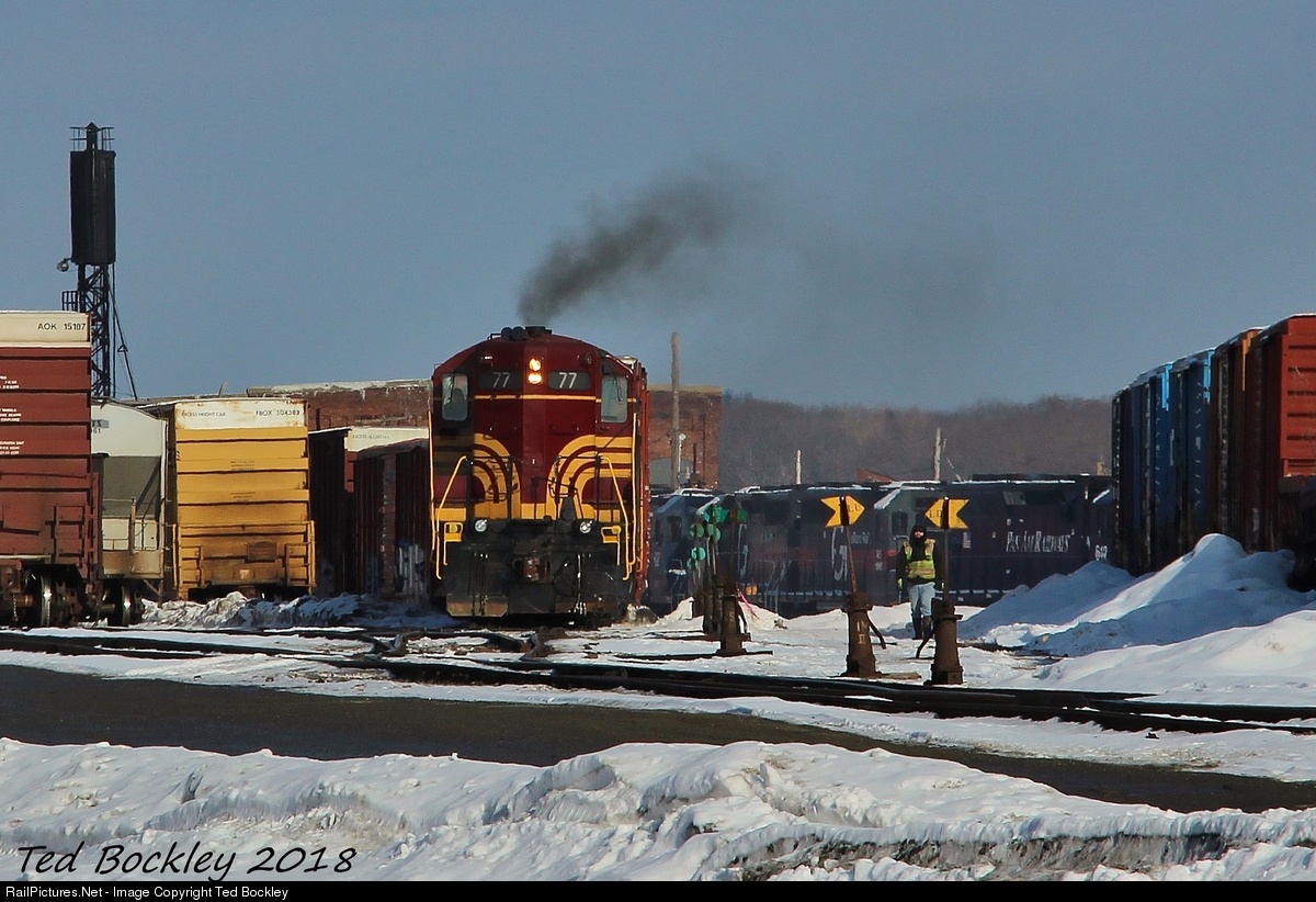With both of the Pan Am's heritage GP9s in charge, the SAPPI paper job pulls through Waterville to yard their train. These veteran locomotives soldier on into their 6th decade of service since they were delivered to the Boston & Maine RR in 1956. The last two active GP9s on the roster roll on despite the dead line of newer GP40s and SD40s as the GE invasion continues on this once EMD dominant railroads.