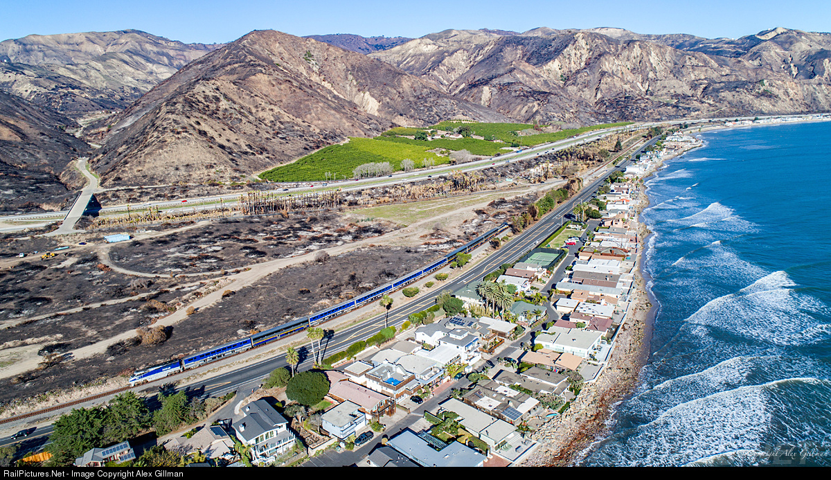 | One can not fully understand the scope of the Thomas Fire until you drive along the coast and see things for yourself. Covered for years with lush vegetation that come spring would be as green as Tehachapi, these hills will now draw attention in another way in the form of their chard soil. On this cool afternoon at Faria Beach, with many of these hillsides providing the backdrop, Amtrak 769 hustles west with additional equipment from Oakland on the rear. |