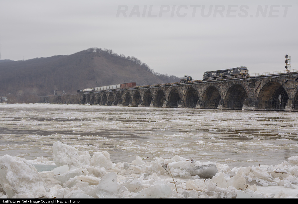 | On a dreary January day in Central Pennsylvania, a short manifest waits for clearance into Enola Yard. The Susquehanna river had been frozen solid under a few inches of ice since around Christmas and is just now melting, causing ice jams all along the river, like what's shown here in the foreground. |