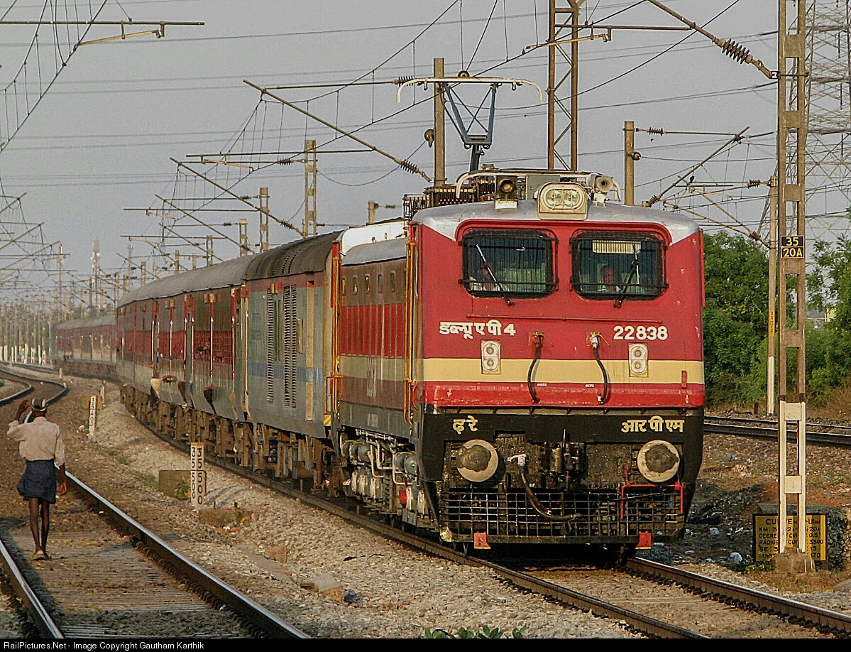 | On a bright sunday evening, ROYAPURAM WAP-4 blending with the Chennai-Mangalore express,swiftly approaches Swvvapet Road station. |