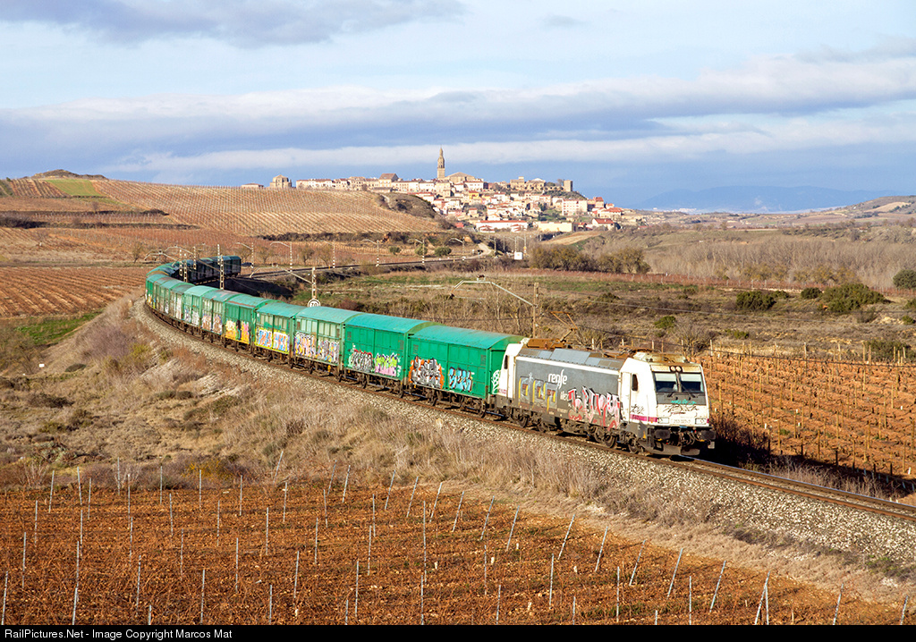 I do not have many pictures of locomotives with graffiti in RailPictures. Normally that kind of photos are forgotten in the depths of a hard drive but sometimes I think that if I hide them, I probably offer an ideal and unreal image of the Spanish railway. Unfortunately, if any of you come to Spain to know our trains, you will probably find a freight like this one absolutely massacred with graffiti until the last car. Paper freight Santurce-Azuqueca at Briones.