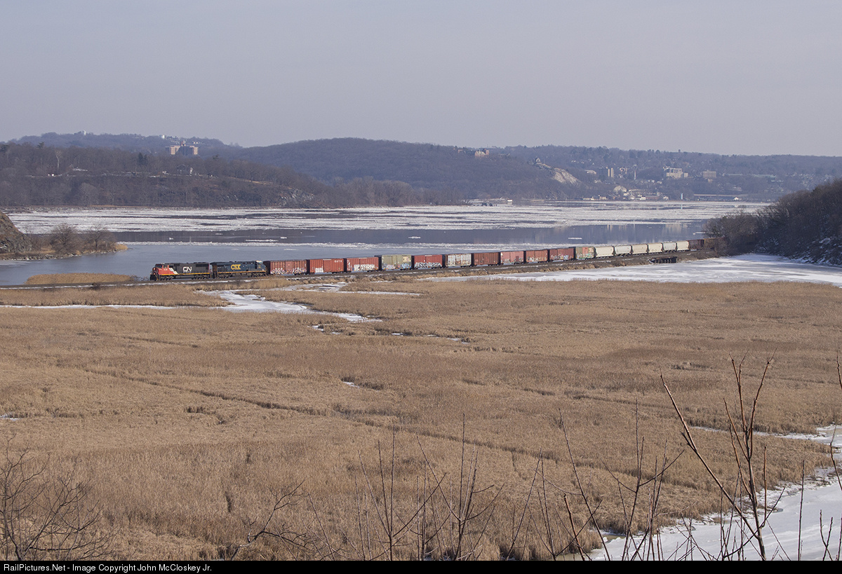 Q43420 is seen racing north onto Iona Island with a CN SD75i leading.. The Hudson River can be seen behind the train with chunks of frozen ice left over from the freezing previous week.