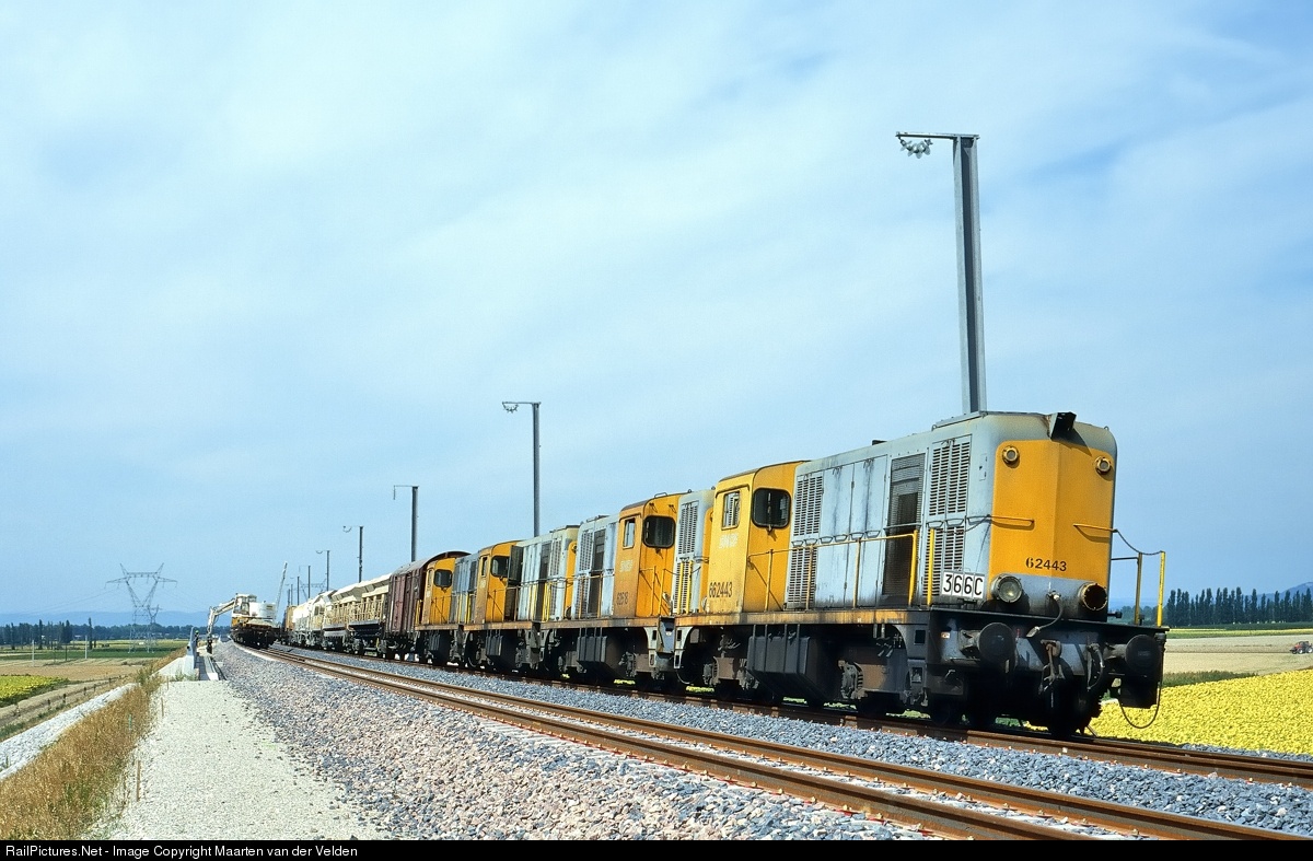 | SNCF 662443, 662518, 662414 and 662444 with a traine for producing the concrete to stabilize the catanarypoles. These locomotices were bought from NS in 1991 and were still in Dutch livery.