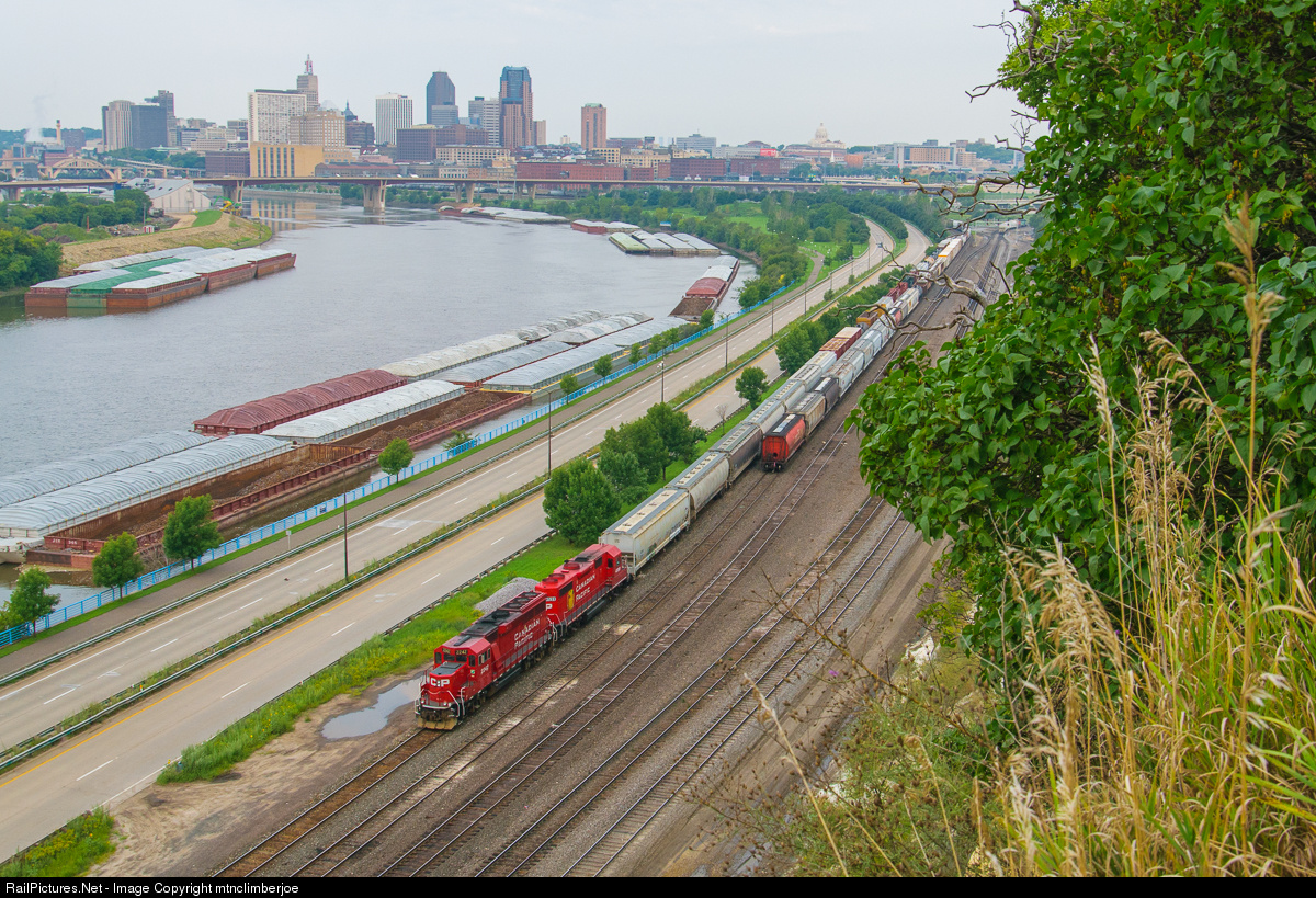 A pair of CP GP's lead a local along the Mississippi and into CP's Saint Paul yard.