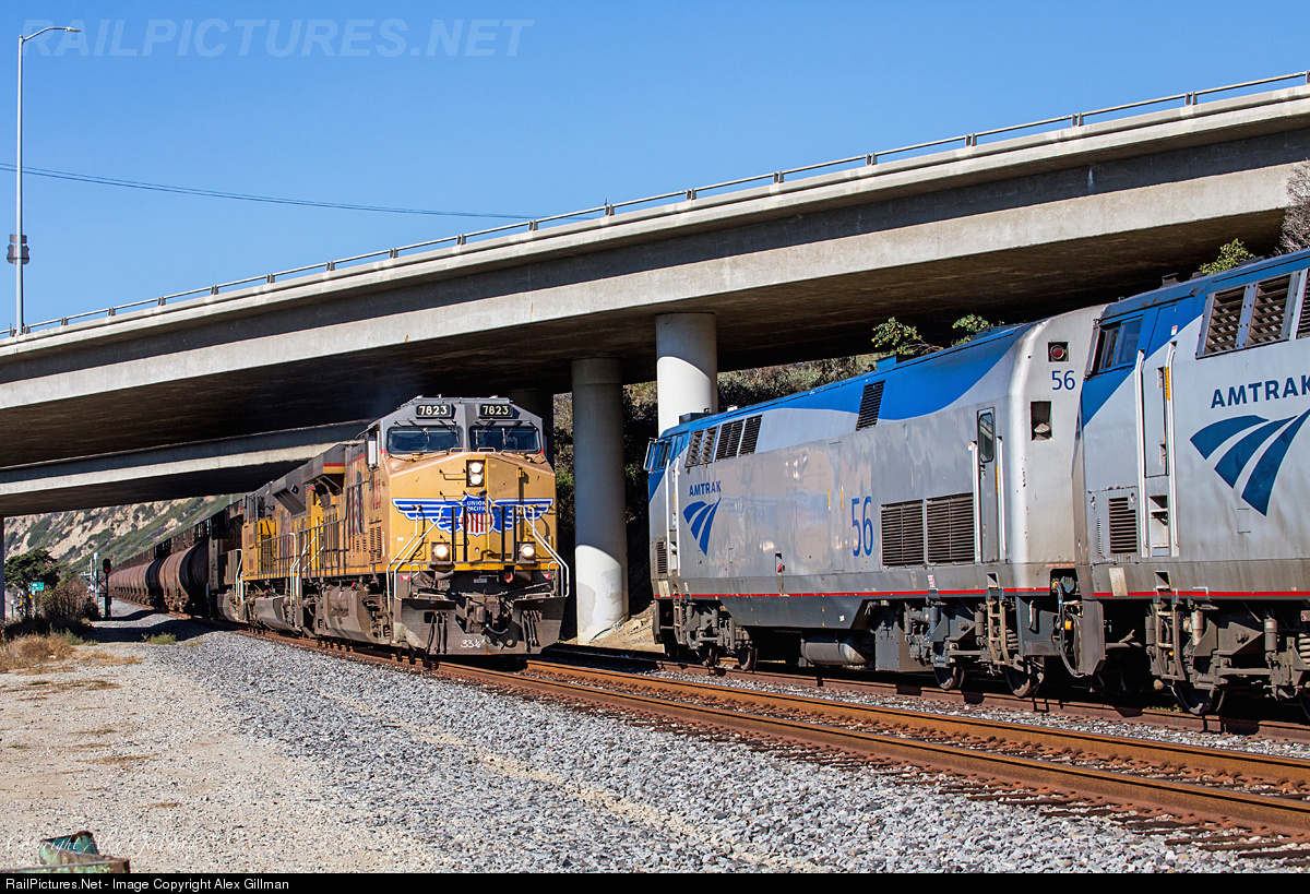 | Meet me at Seacliff. After sitting in the siding for almost half an hour, the crew of Amtrak 14 finally see their time at Seacliff drawing to a close as they meet the UP 7823 with the southbound oil cans. |