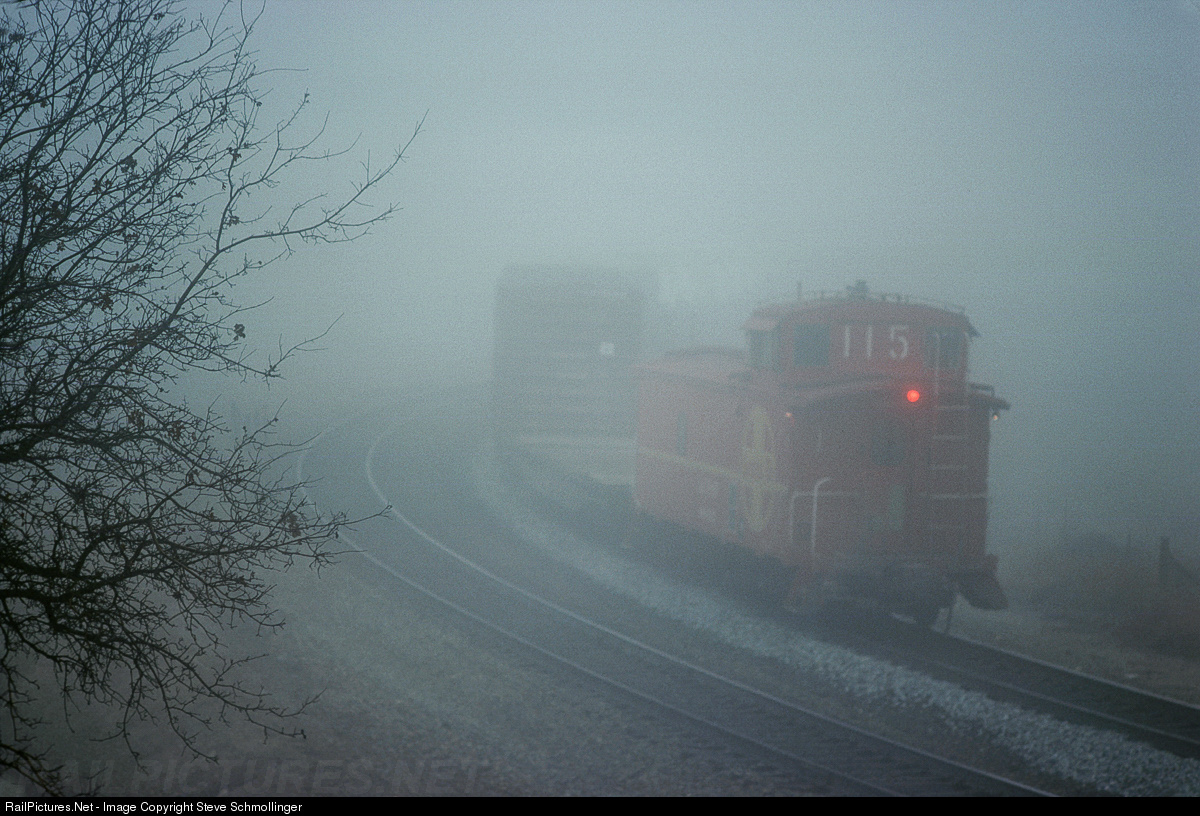 In extremely thick and frigid fog, the caboose of a Santa Fe westbound disappears with the rest of its train into the mist at Cable Crossover. The photographer is unsure if such thick fog is a common occurrence this high up on the mountain, but this is the only time he's experienced it this close to the summit--and never before this dense.