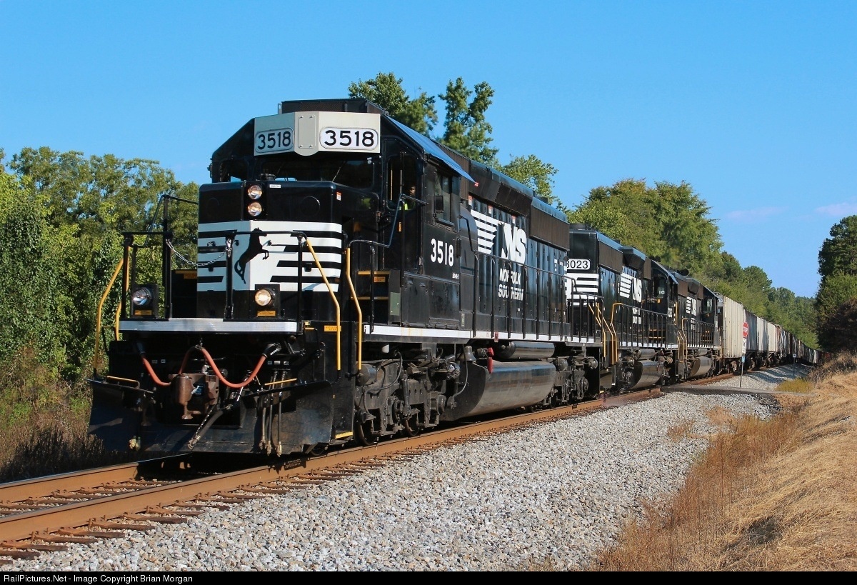 Southbound Norfolk Southern manifest train #371 roars through the Valor Way grade crossing just south of CP "Freeman", milepost 50 of NS's Atlanta North District, approximately five miles north of Sugar Valley, Georgia behind NS SD40-2 #3518, NS GP40-2 #3023, and NS SD40-2 #3490.