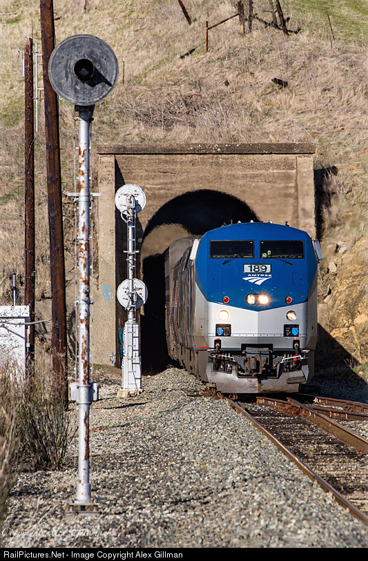 | Passing some of the last remaining, active searchlights on CTC territory in California - Amtrak's southbound Coast Starlight decends through Tunnel 11 and into North Chorro on a windy afternoon on Cuesta Pass. |