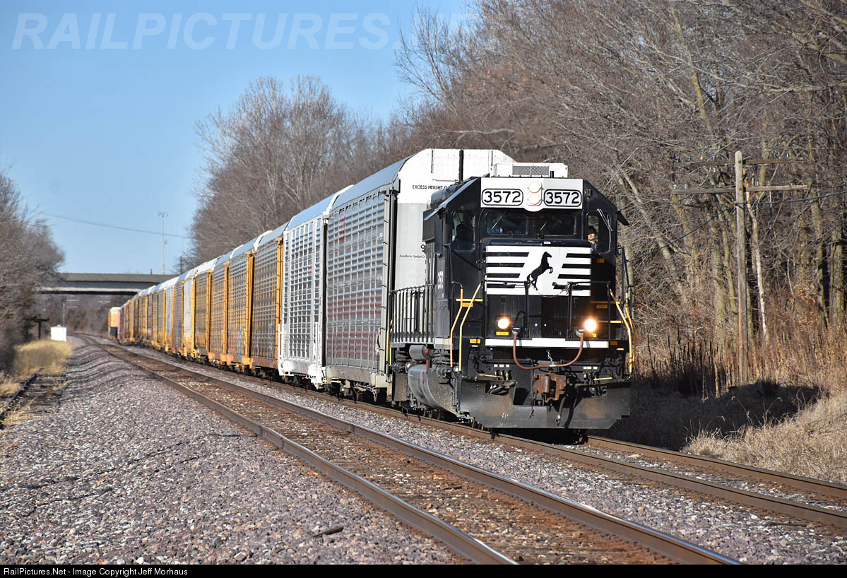 | Formerly BN 8164, NS 3572 exits NS's Wentzville Yard with a load of brand new Chevy Colorado's and GMC Canyons bound for Luther Yard in St. Louis. Seeing a SD40-2 leader on point of the D67 local is not common, so I took advantage of it.