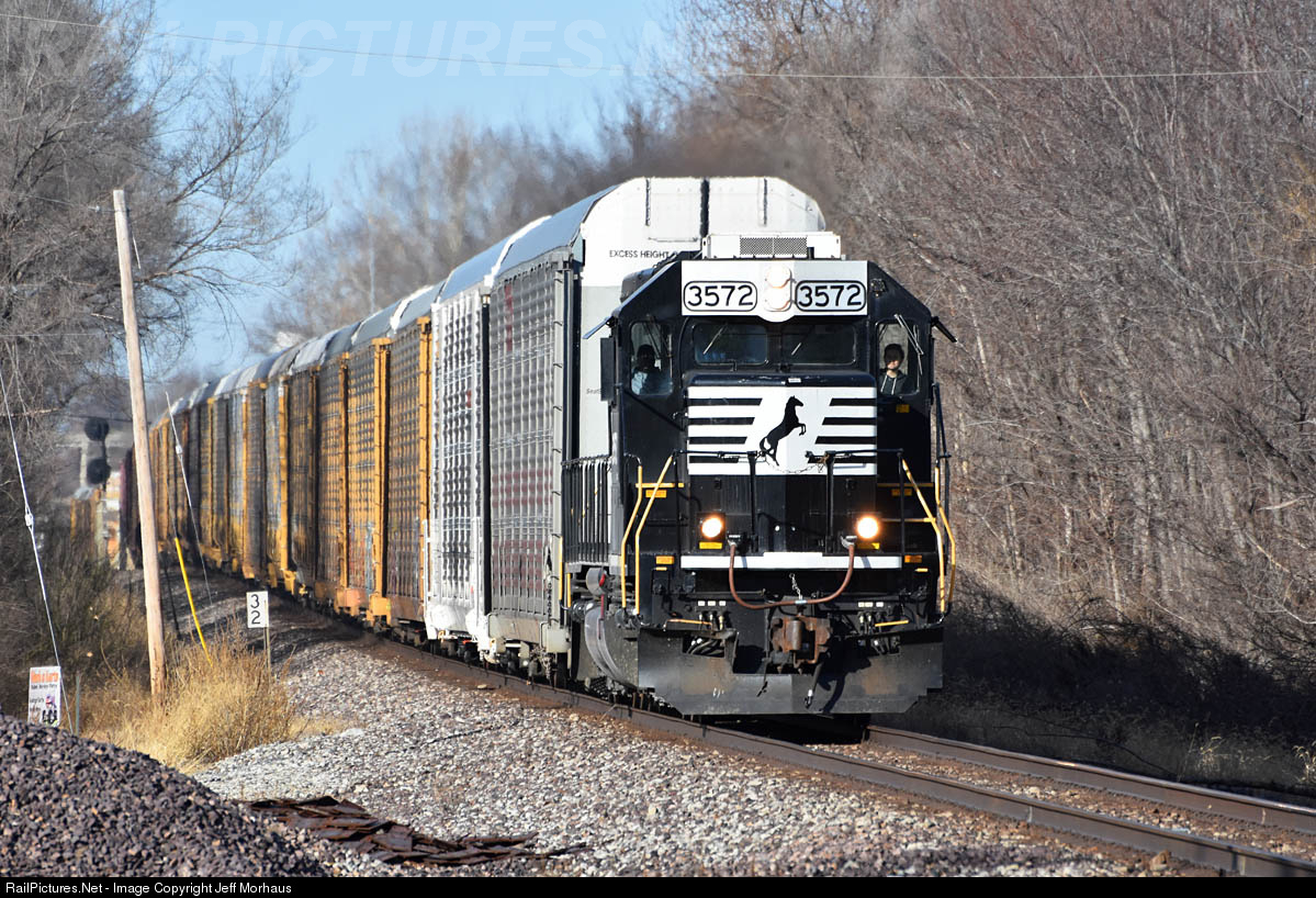 | Formerly BN 8164, NS 3572 splits the searchlight's passing through old St. Peter's with a load of brand new Chevy Colorado's and GMC Canyons bound for Luther Yard in St. Louis. Seeing a SD40-2 leader on point of the D67 local is not common, so I took advantage of it.
