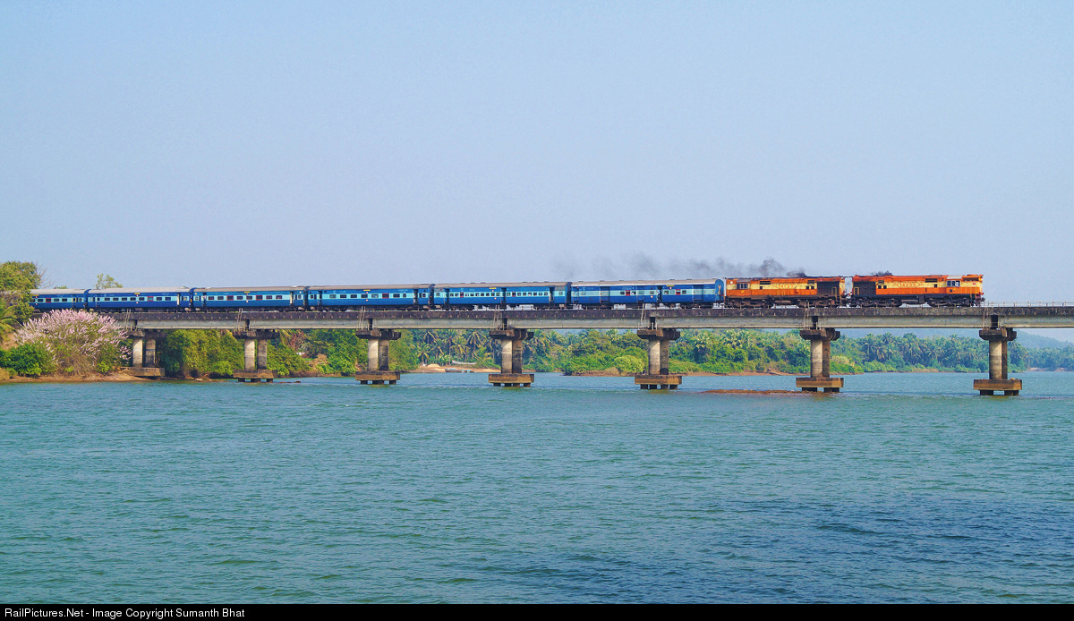 Late running 16337 Okha-Ernakulam Express crossing swarna river.