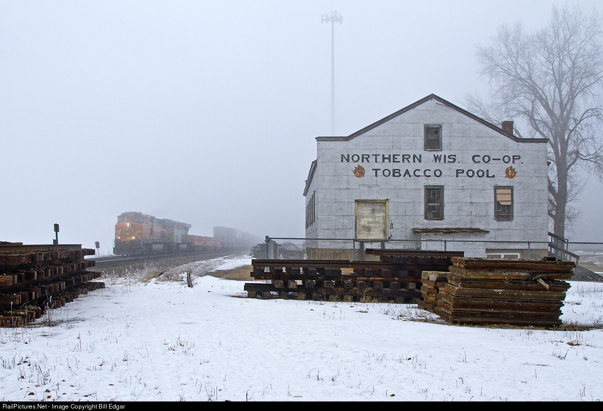 BNSF 5308 races through fog after re-crewing its train at North La Crosse at Genoa, WI. The southwestern corner of the state of Wisconsin was once known for its tobacco industry.