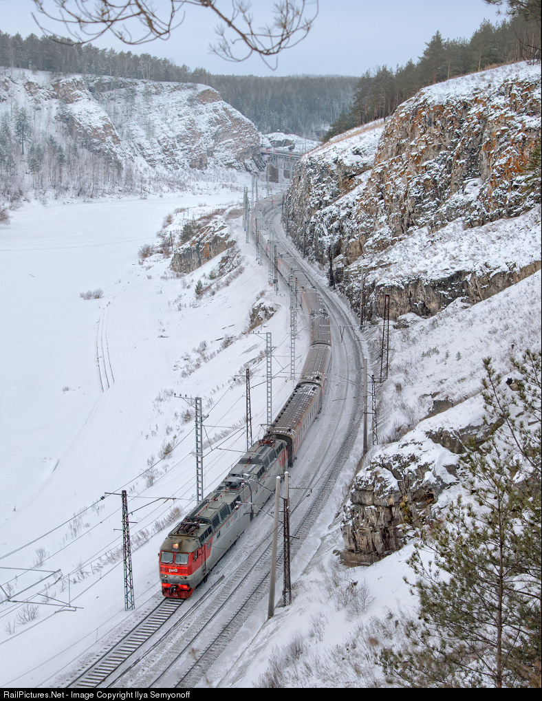 ChS7 DC electric locomotive goes with passenger train at Trans-Siberian Railway near Ust-Katav city at the south of the Ural mountains. On the background you can be seen a bridge over the Yuryuzan river. At that point the river forms the border between the two regions of Russia - Republic of Bashkortostan and the Chelyabinsk region.