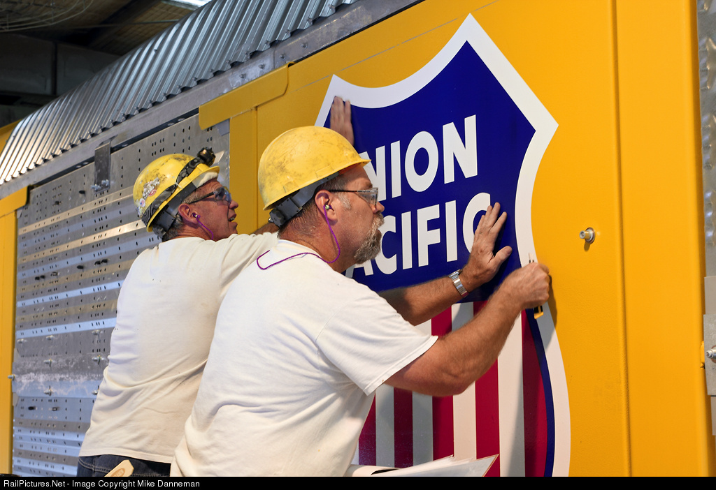 Two painters at Union Pacific’s De Soto car shop in Missouri put the finishing touches on newly-built autorack ETTX No. 715001 as they add UP logos and other lettering to the cars on September 28, 2011. The racks are built at the shop and added to new TTX flats, which are then painted at lettered.