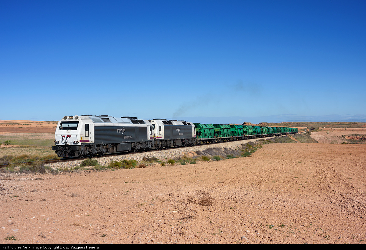| Loaded coal train from Tarragona to Andorra power plant with 333.388 and 333.310 at Samper de Calanda. |
