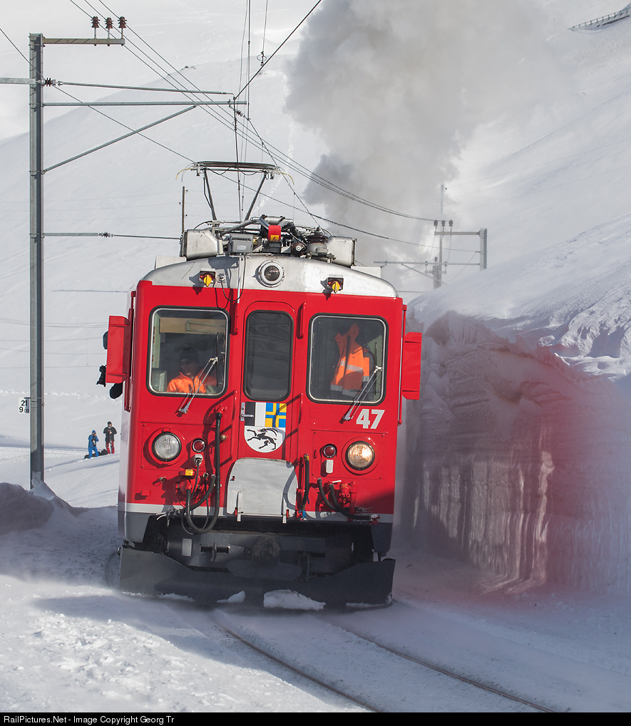 Railcar ABe 4/4 # 47 of the RhB during the snow fighting demonstration event on the Bernina line near Ospizio Bernina. This 680 kW railcar was built in 1972 by SWS, SAAS and BBC and is based at Poschiavo nowadays, used by the infrastructure department. On one of the pantographs, a system for protection of the formation of ice on the contact wire is installed, see picture 637623. The steam in the background is from the rotary snow blower Xrot d # 9213.
