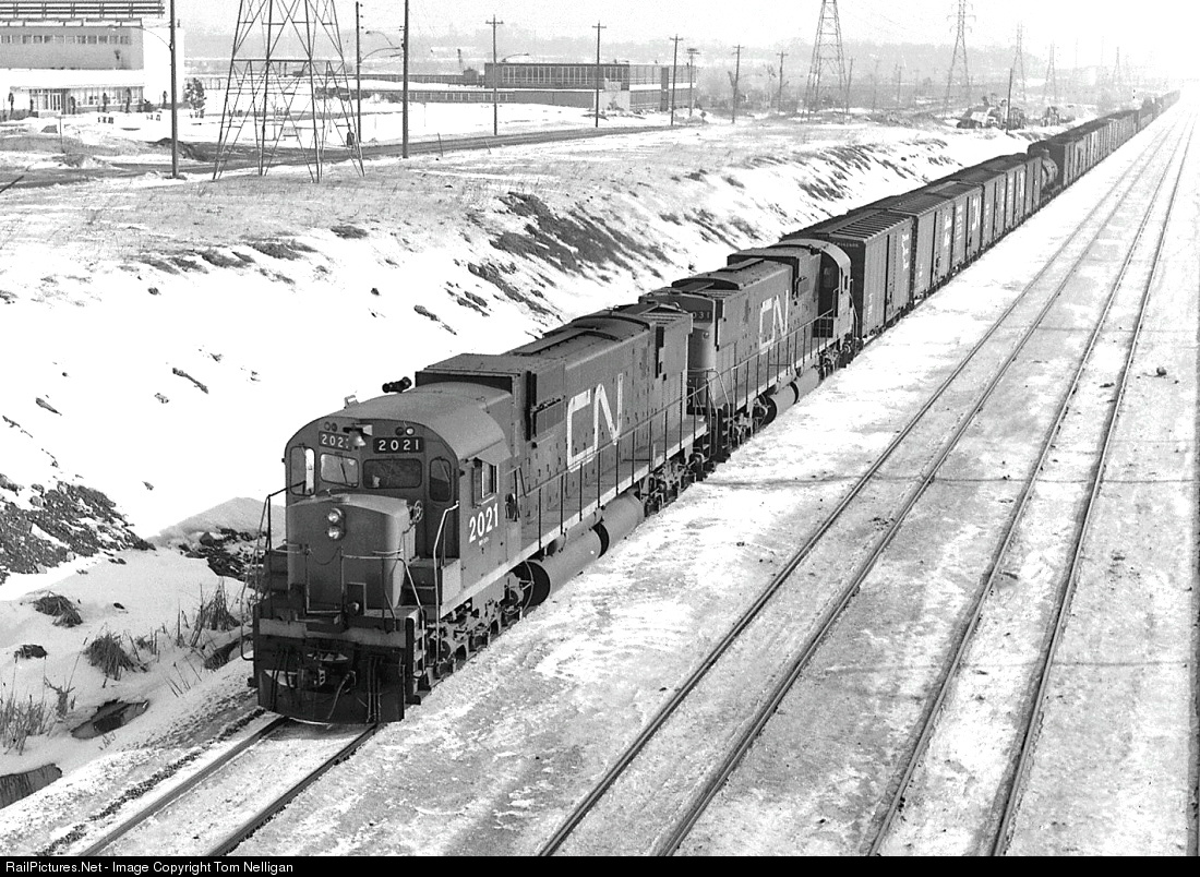 | On a hazy late winter morning, a westbound Canadian National freight that has just departed CN's Montreal yard is headed out of town behind a pair of MLW C630Ms. |