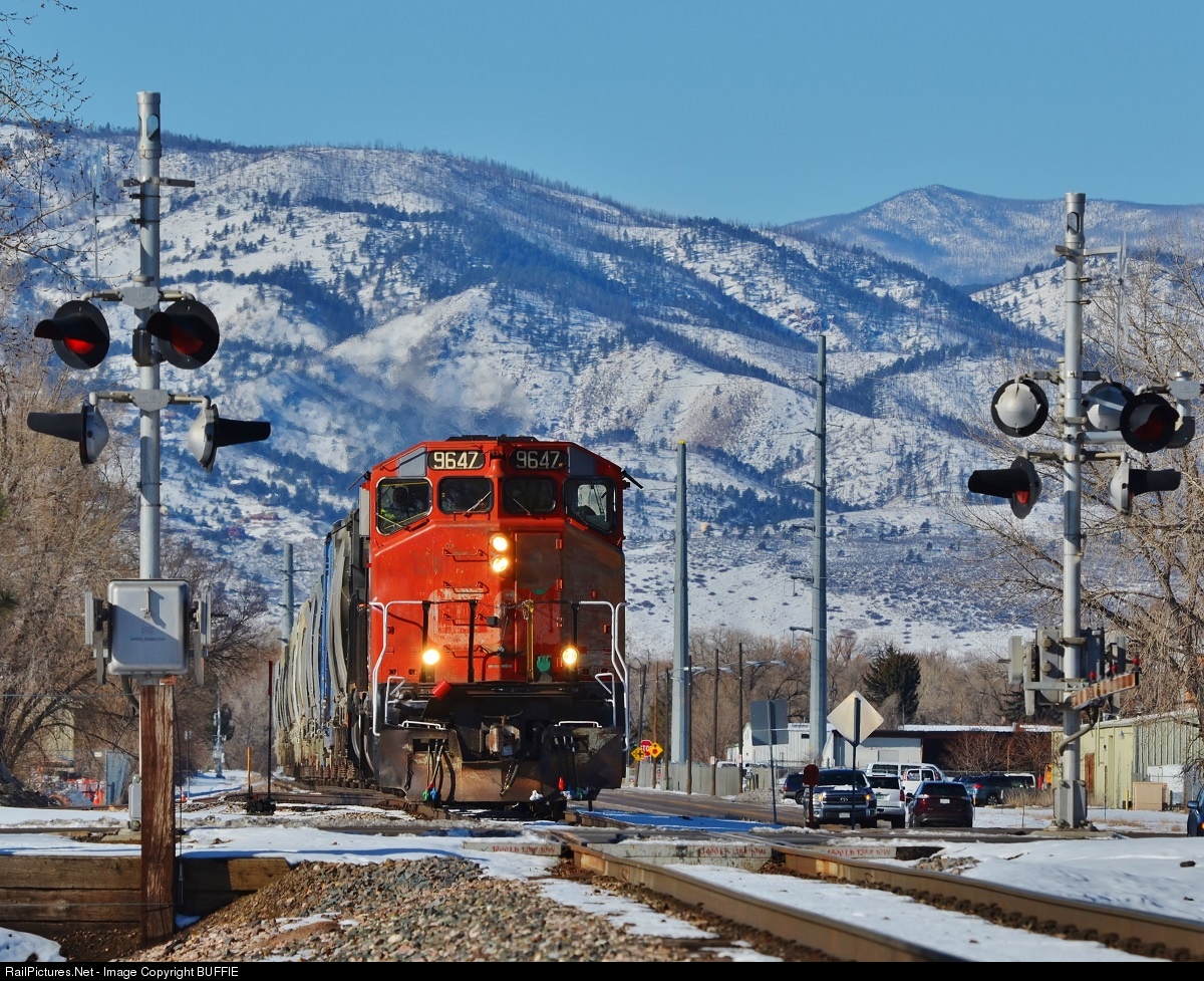 A fresh layer of snow in the foothills of Fort Collins, Colorado provides a backdrop for OmniTRAX's 9647 (GP40-2LW) as it delivers a small freight to the BNSF yard on the north side of town.