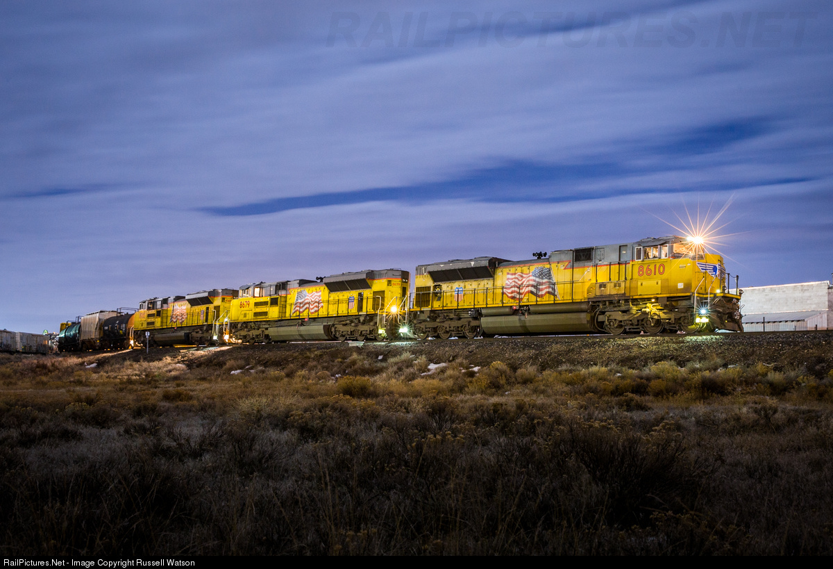 A trio of SD70ACe's lead the 37 car Pocatello, ID to Silver Bow, MT manifest train. The train held the main at Idaho Falls waiting on a Southbound light engine move to make its way in to the yard. After the southbound cleared and gave up its track warrant, the UP 8610 got a new track warrant and departed Idaho Falls, continuing its journey North towards Dillon, MT in the dead of night.