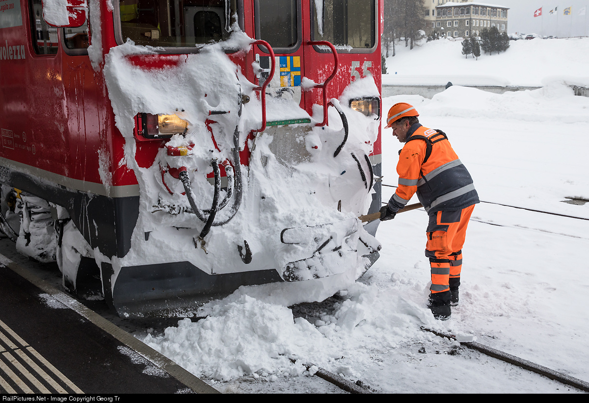 | A railway worker clears the front of railcar ABe 4/4 # 55 after the arrival in St.Moritz. He has to couple the railcar to other cars, so the coupling, air and vakuum brake hoses had to be operational. |
