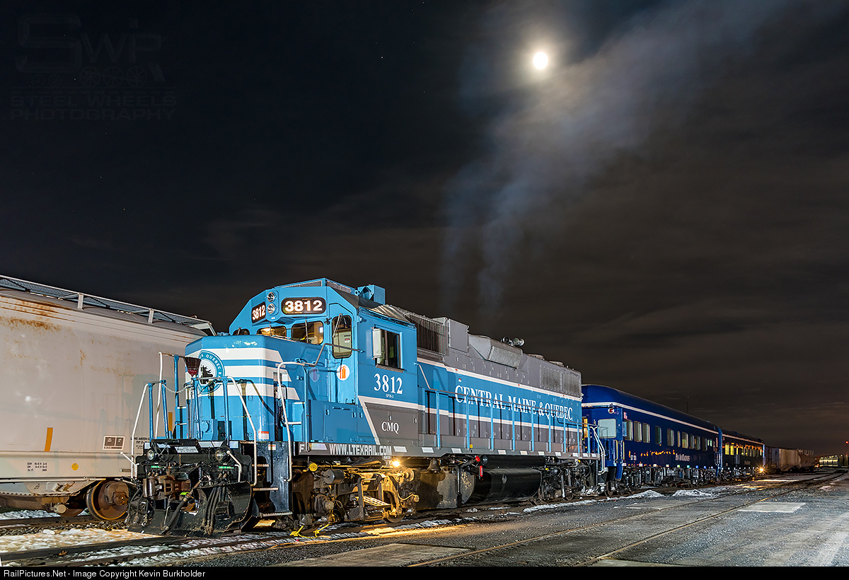 | Central Maine & Quebec Railway GP38-3 3812 idles with Pan Am Railways office cars, Springfield Terminal 100 and 101, within the confines of the Farnham Yard in Farnham, Quebec on January 29. Photo taken with permission and following briefing with CMQ crews. |