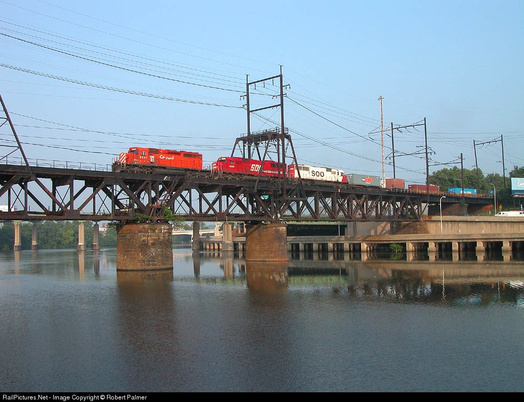 CP train to Philly crosses the Schuylkill River with CP and SOO power.