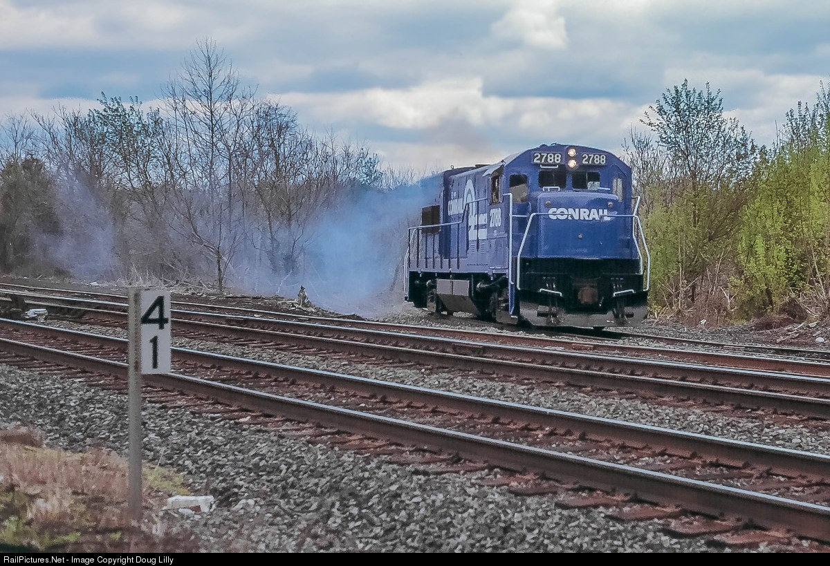 Conrail U23B 2788 reaches the end of the Pottstown Industrial Track in Pottstown, Pennsylvania, and joins the former Reading main line at MP41, just west of Pottstown.