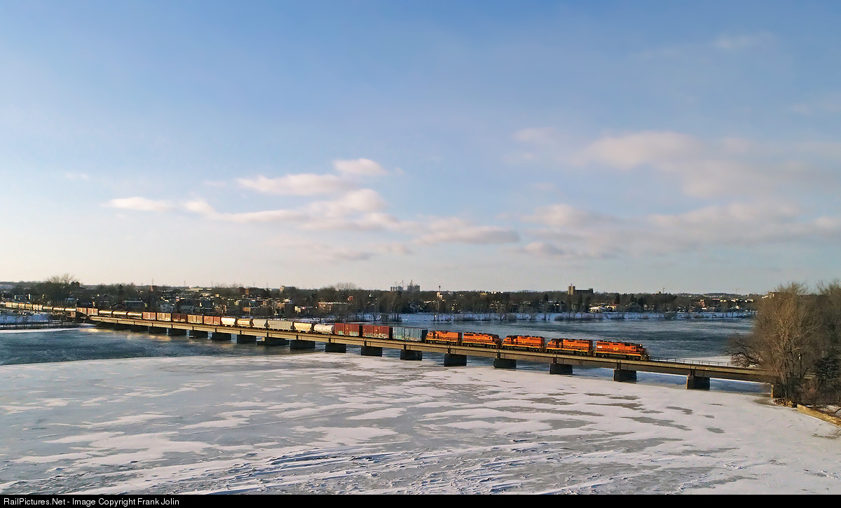 | Detour St Lawrence & Atlantic 394 is crossing the Richelieu River at St-Jean on a cold and breezy afternoon. Trailing locomotives are QGRY 3102, SLR 3008, SLR 3804, SLR 804 |