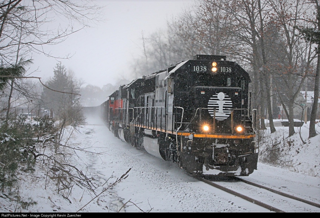 | A loaded ore train heads south through Grove City on its way to Bessemer where it will turn and bring empties back north. A light snow is falling as the train kicks up a fresh layer of powder at track speed. This location is part of the former Bessemer and Lake Erie Railroad now owned by CN. Although the Bessemer orange is a rarer sight today along the line, fallen flags are not, as trains are often led by ex. IC SD70s. This particular SD70 is painted in IC's "death star" paint scheme. |
