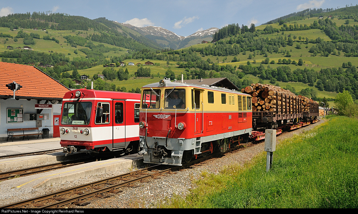 | 2095.01 from Pinzgaubahn (a subsidiary of SLB) reaches Niedernsill, destination for two standard gauge stake cars on four narrow gauge roll cars. On the left VTs 12 is ready for departure to Zell am See. |