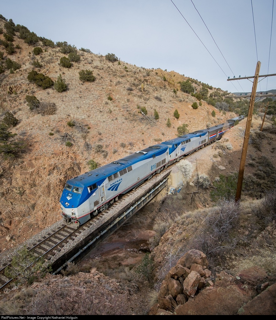 | After a long chase from southern Colorado, the westbound Southwest Chief negotiates one of the final challenging topographical features known as Apache Canyon. A steep canyon complimented by a stream, this area can become popular among locals during the summer. |