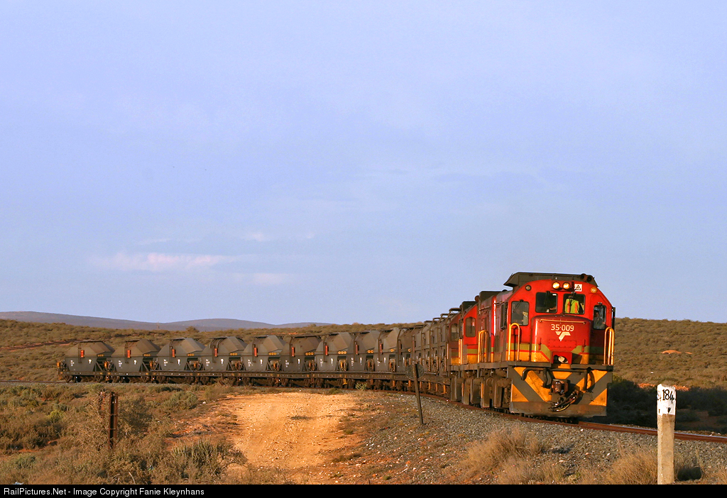 Three class 35s lead a load from the Namaqua Sands plant back to loop 4 of the ore line here at Koekenaap in the late afternoon.