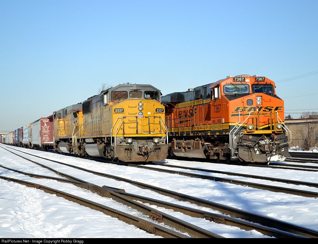 UP SD60M 2337 and BNSF 7367 hold at Scott St in Franklin Park with their respective trains.
