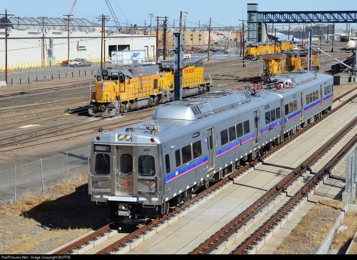 Denver RTD's commuter train #4057 runs past the 36th Street Yard, giving riders a great view of the large yard in central Denver.