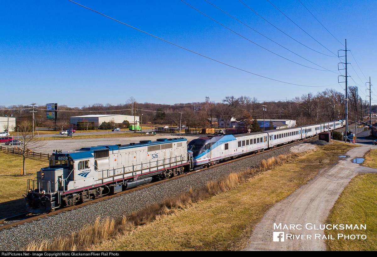 Amtrak 526 (GP38H-3, ex Amtrak 198, exx- Go Transit 506/9806, nee CN 606, 12/1966) leads the Turbo consist across Cooch's Field in Newark, DE on Thursday, January, 25, 2018. They will stop at the Wilmington Shops to await the end of rush hour before departing for their ultimate destination in New Jersey.