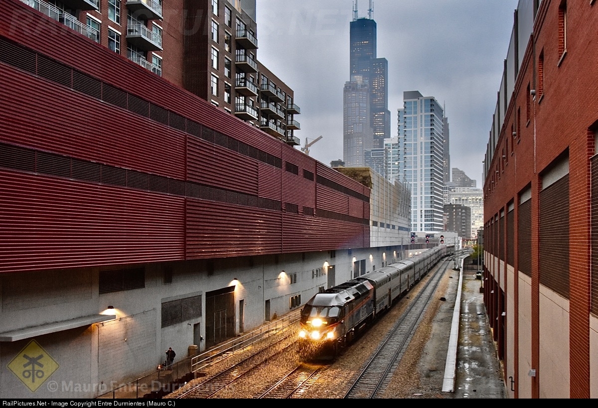 Metra service leaving from LaSalle Street, in a heavy rain over Chicago in late afternoon of November 1 from last year, with a classic icon of the city in the background, the Willis Tower, built as and still commonly referred to as the Sears Tower, with their 1,450 foot (442m).