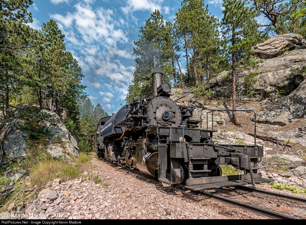 Articulation. How do you get a 2-6-6-2 locomotive around a sharp curve? The answer is articulation. This engine has two sets of drivers. the boiler and tank sits firmly over the rear set and the front set, along with the (huge) pilot pivots on its own. So, this engine is a bit like a pair of 0-6-0s double-heading...and sharing one boiler carried by the road engine....if that makes any sense. The articulation is difficult to see for a stationary observer trackside, but if you ride in the front of the coach that sits just behind the locomotive on the return trip from Keystone to Hill City, you'll see quite a show. The locomotive is running in reverse on that segment of the trip, so the smokebox is directly in front of the coach windows. I had the pleasure of watching this show with Asst. Maintenance Operations Manager Scott Harlan, for most of the return trip. Scott indicates that the railroad has purchased a second, nearly identical 2-6-6-2T (which will be BHCR #108), and is currently restoring it to operation. They hope to have it running on this most interesting line within the next couple of years.