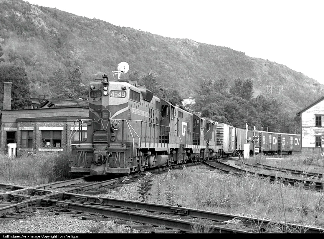 Central Vermont train 429, which ran almost the entire length of the railroad from New London, CT, to St. Albans, VT, hits the diamond at Bellows Falls, VT, on a summer afternoon. The power is a trio of CV and Grand Trunk GP9s, a common mix at the time as locomotives moved freely between Canadian National's two New England subsidiaries.