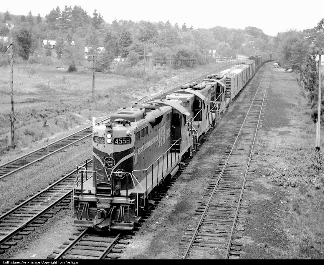A Grand Trunk GP9 in the classic green paint scheme leads the trio of GT and Central Vermont Geeps rolling north on CV train 429 (New London, CT, to St. Albans, VT) at Millers Falls, MA. The B&M Fitchburg Division tracks that paralleled CV here are on the left.