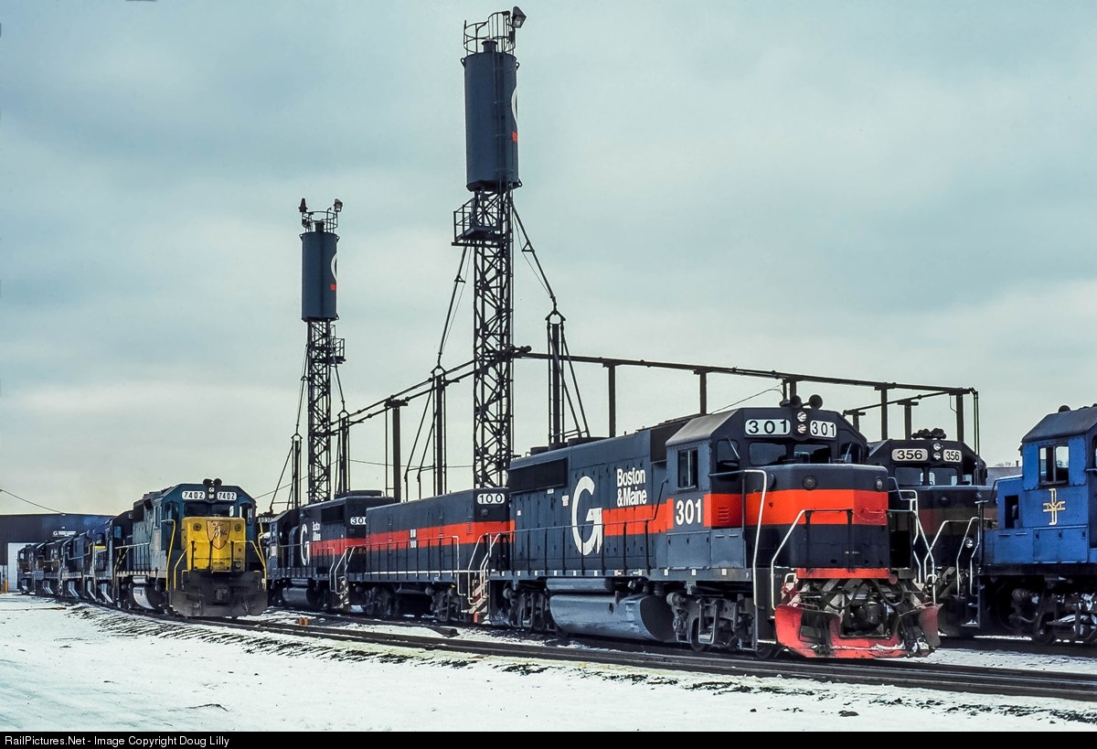In March, 1983, the Boston and Maine rebuilt former Union Pacific GP9 134 into a road slug, numbered it 100, and put it to work between GP40-2’s 300 and 301. Less than two years later the trio lost its B&M blue paint in favor of a Guilford scheme. Later that year, the slug set is seen here at the servicing area of Delaware & Hudson’s East Binghamton yard.