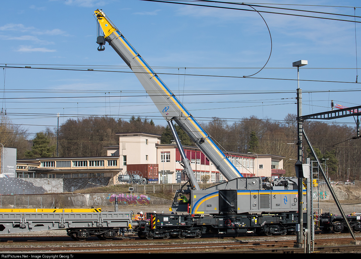 Brand new large railway crane "Kirow" KRC-1200 FR (France) Multi Tasker # 99 87 9319 507 for the french "Travaux Ferroviaires Français" during tests for homologation in Bülach. The Multi Tasker is a truly multi-purpose device. Its excellent operational qualities are demonstrated when it is utilised for switch construction, track and bridge construction and accident recovery. Kirow from Leipzig/Germany, is the world market leader for railway cranes