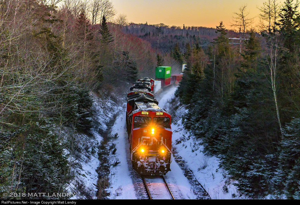 After cresting the grade and starting their descent at Folly Lake, CN Q120 round the bend, picking up speed, approaching Londonderry, Nova Scotia with the sun rising in the background.