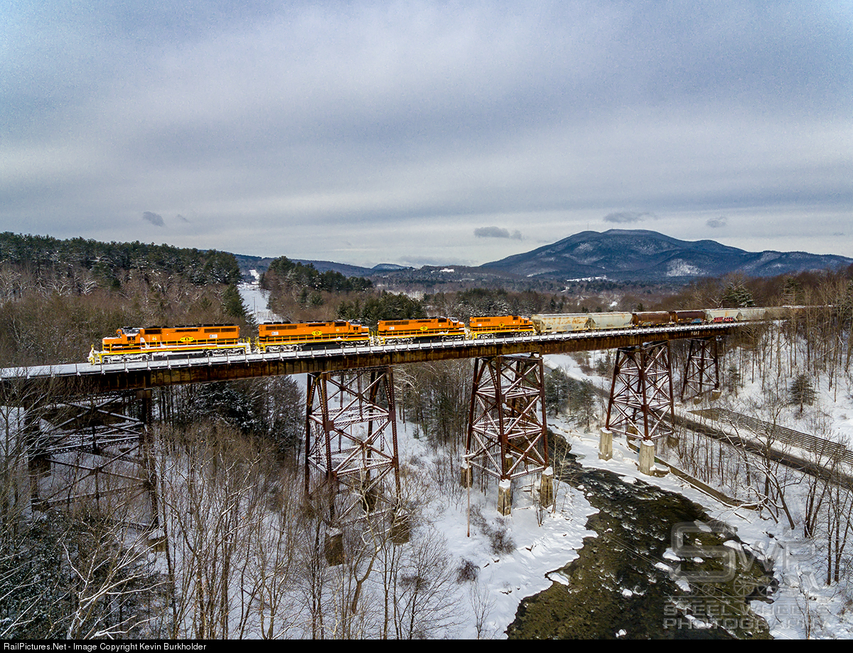 New England Central Railroad’s St. Albans, VT to Palmer, Massachusetts train 324 is seen crossing the Sugar River Trestle at Claremont, NH with NECR SD40M-2s 3477, 3474 and 3476, as well as CSOR GP38-2 2021 along for the ride.