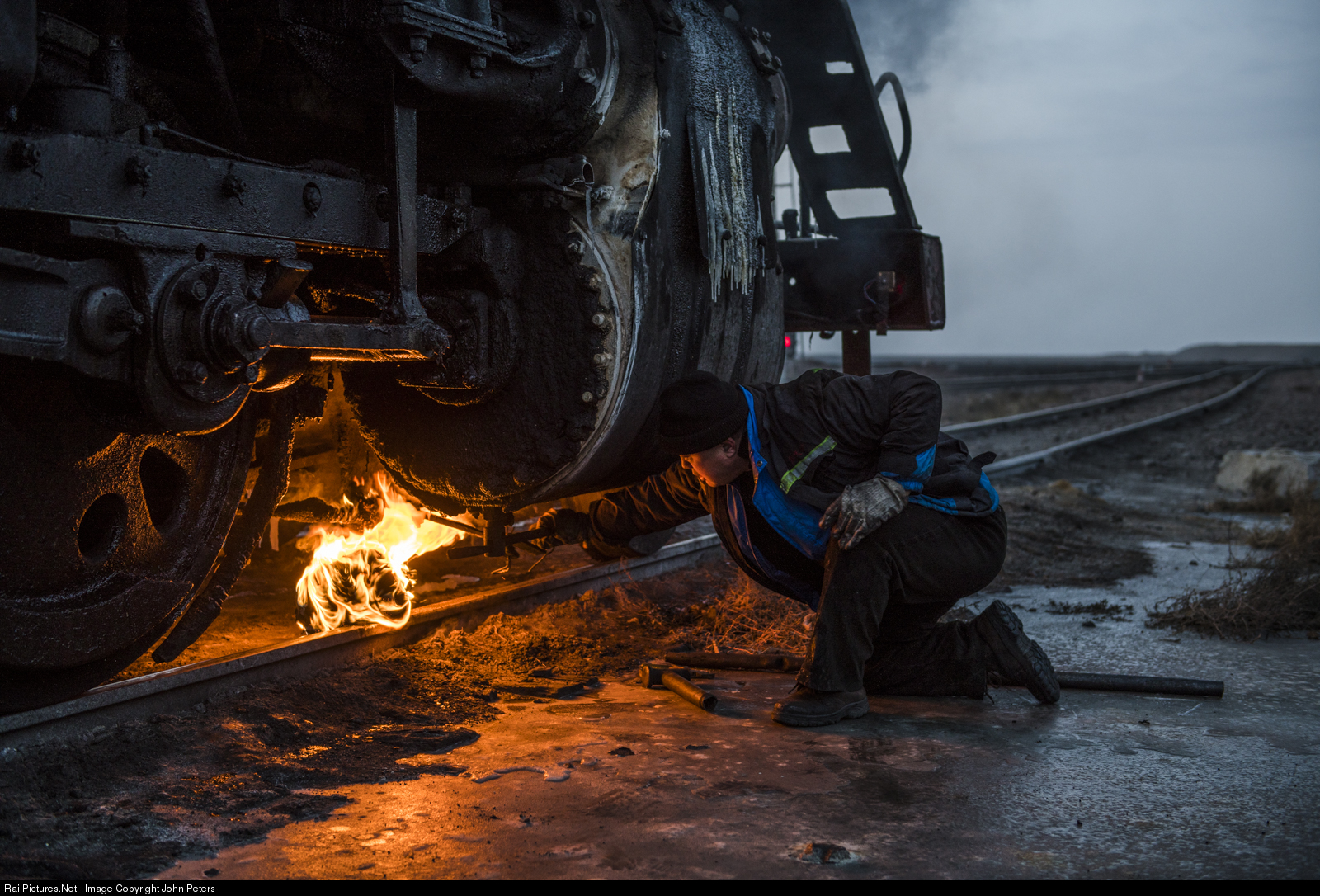 During engine preparation after shift change at East Yard, the Driver builds a fire under the Rodding to the Cylinder Drain Cocks in an attempt to unfreeze it. At a time of the year when the temperature never goes above zero, this is nothing out of the ordinary. January 5th 2018, East Yard Sandaoling Open Cut Coal Mine Nth West China.