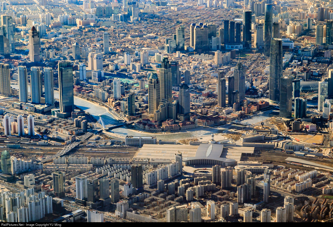 Bird view of Tianjin Station. A CRH3C high speed train is leaving for Tanggu.